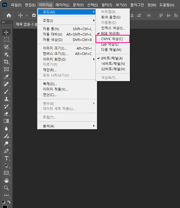 포토샵 작업 한 데이터가 열린 상태에서 이미지(Image) > 모드(Mode) > CMYK 색상(CMYK Color)을 선택합니다.