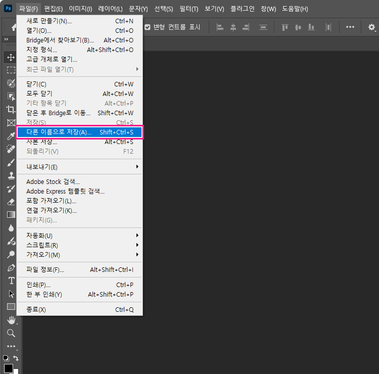 파일(File) > 다른 이름으로 저장(Save As)를 클릭합니다.