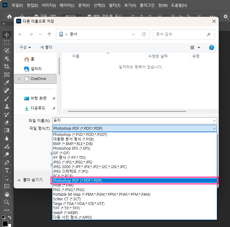 저장할 파일 형식에서 Photoshop PDF를 선택합니다.