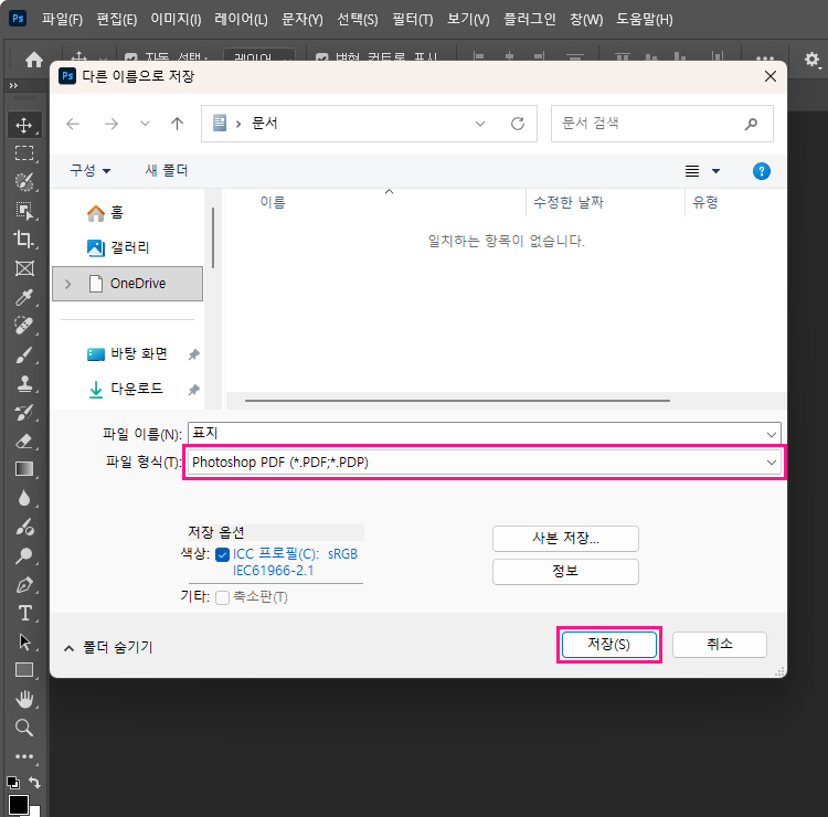 파일 형식이 Photosohp PDF가 맞는지 확인 후 저장을 클릭합니다.