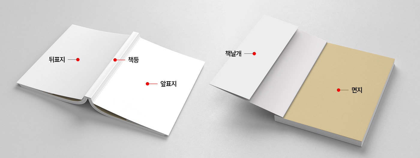 | 책등 | 책 제목(부제목), 저자명, 출판사명 | 면지 | 표지와 내지 사이의 종이로 내지와 표지가 떨어지는 것을 방지함 |