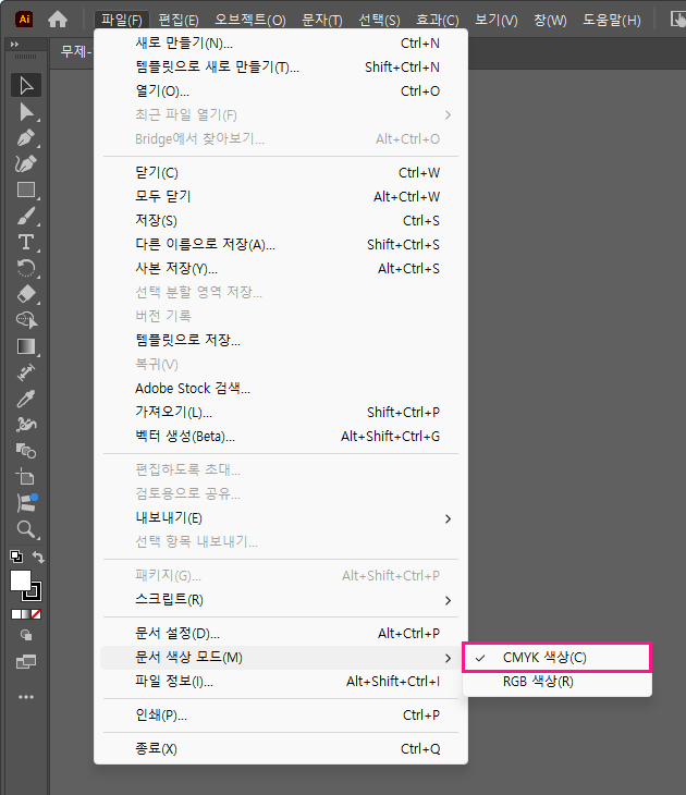 일러스트레이터(Illustrator) 작업 한 데이터가 열린 상태에서 파일(File) > 문서 색상 모드(Document Color Mode) > CMYK 색상(CMYK Color)을 선택합니다.