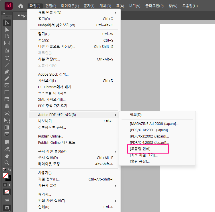 파일(File) > Adobe PDF 사전 설정(Adobe PDF Presets) > [고품질 인쇄] [High Quality Print]를 클릭합니다.
