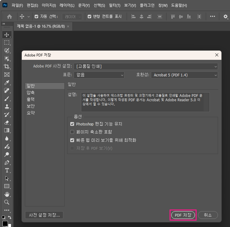 파일 형식이 Photosohp PDF가 맞는지 확인 후 저장을 클릭합니다.