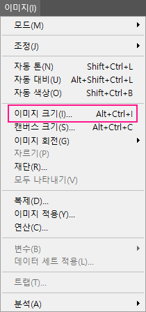 포토샵에서 사용할 이미지를 열어 이미지(Image) > 이미지 크기(Image Size)를 선택합니다.