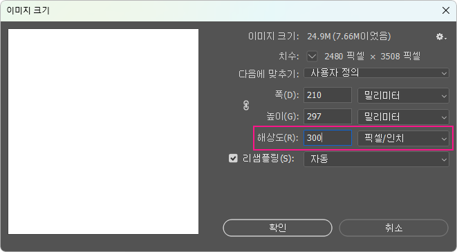 이미지 크기(Image Size) 창에서 해상도(Resolution) 값이 300dpi가 맞는지 확인합니다. 300dpi 이하인 경우 300dpi 이상으로 변경해 주세요.